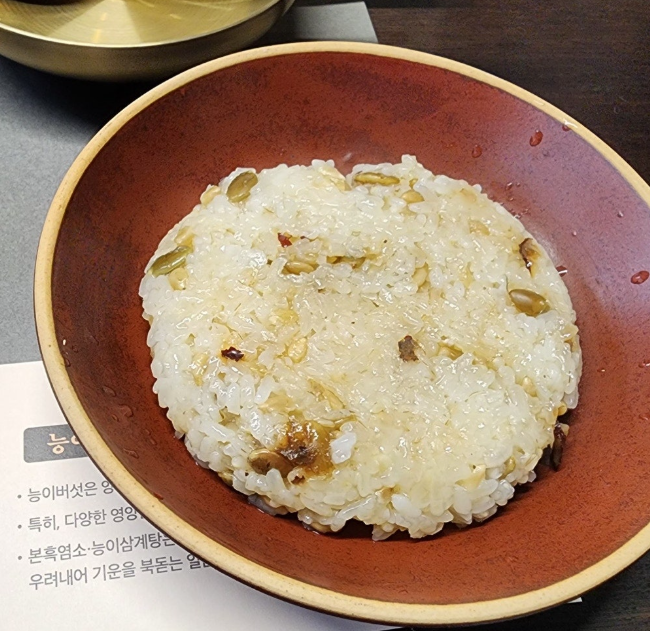 '능이삼계탕'은 전통적인 삼계탕에 더해 능이버섯을 활용한 메뉴입니다. 능이버섯은 면역력을 높이고