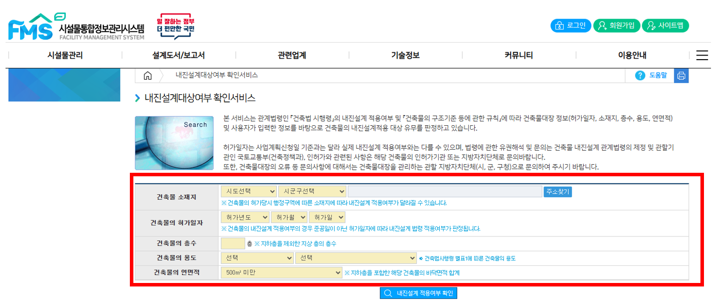 1. 상단메뉴 : 시설물관리 > 내진설계대상여부 확인서비스