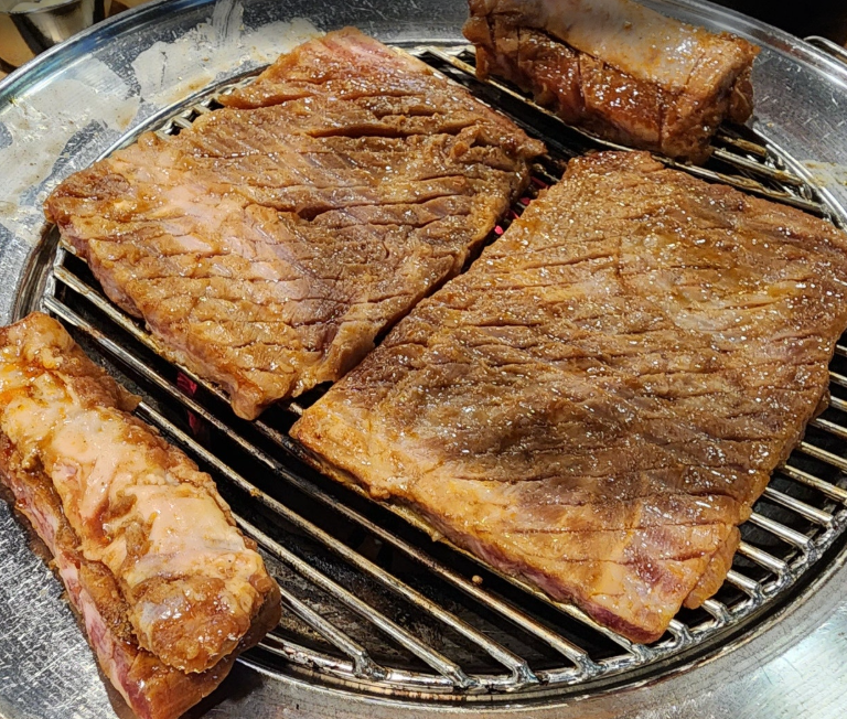 두툼한 갈비가 숯불에 지글지글 구워지는 모습만 봐도 배가 고파지더라고요.